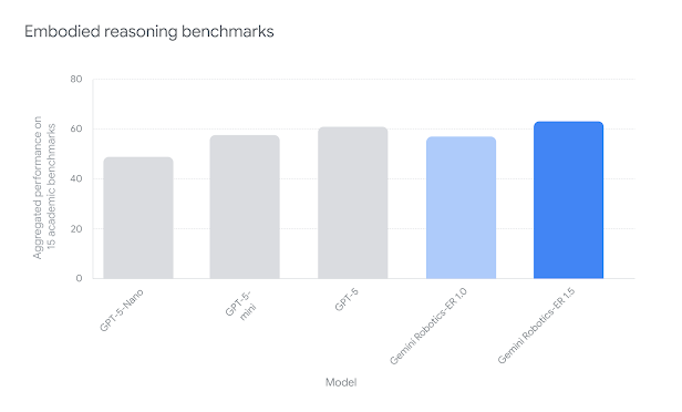 Gemini Robotics-ER 1.5는 체화된 추론(embodied reasoning)에 최적화된 최초의 사고 모델입니다. 이 모델은 저희의 신뢰할 수 있는 테스터 프로그램에서 얻은 실제 사용 사례로부터 영감을 받아, 학술적 벤치마크와 내부 벤치마크 모두에서 최첨단 성능(state-of-the-art performance)을 달성합니다.